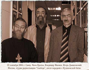 Яков Кротов: Спасибо. Итак, Куликовская битва. 21 сентября в Москве прошел крестный ход в честь, как было написано в газетах, "победы Русского духа и Русского оружия над языческо-католическо-мусульманско-буддийской Ордой Мамая". Священник Владимир Силовьев, руководитель издательского отдела Московской патриархии и настоятель лрама в Старом Симонове, где по преданию лежат мощи Пересвета и Осляби, заявил, что их противник Челубей был монахом буддийского ордена, который умел левитировать, ударять в энергетический центр противника, и поэтому считался непобедимым. Так что Пересвет сумел его победить только благодаря помощи божьей. "Именно это, - цитирую отца Владимира, - позволяет нам говорить о духовном поединке и битве вообще".