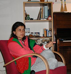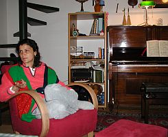 Валентин Барышников: Пока мы ехали сюда двести километров из Праги, стемнело. Длинными переходами Ива привела нас вглубь дома - в квадратную комнату с окнами во всю стену, выходящими на заградку - в сад. Антон задает вопросы, я осматриваюсь. На улице темно, не видно, но все что можно различить - что-то зеленое, какие-то растения. В комнате тлеет небольшой камин, похожий на буржуйку. За спиной Ивы, забравшейся с ногами в кресло, куда-то дальше в дом уводит винтовая лестница. В комнате - пианино и стеллаж, заполненный разнообразными инструментами.